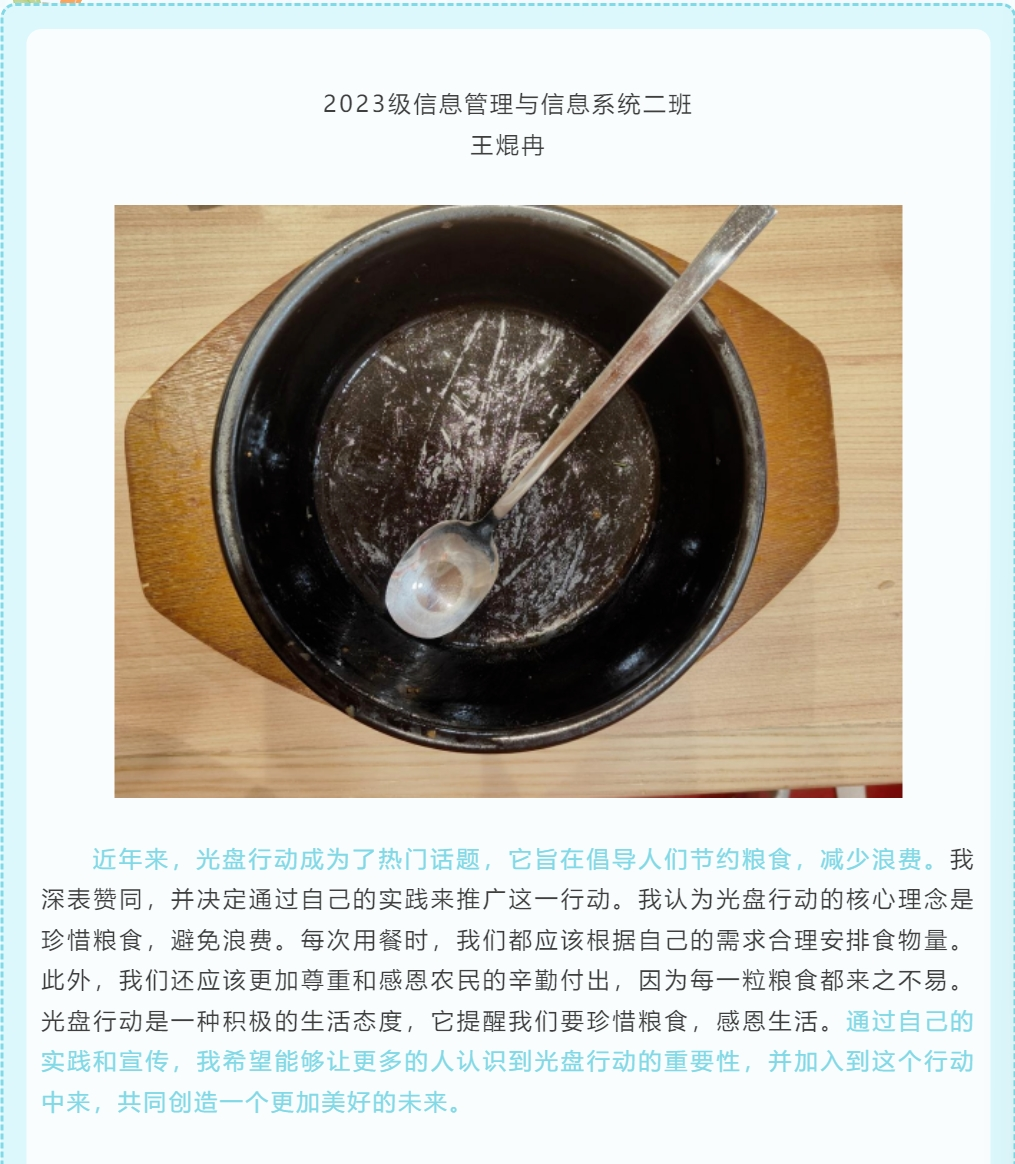 桑田碧海须臾改,节俭之风不可移。为响应习近平总书记对“厉行节约,反对浪费”的号召,进一步增强同学们珍惜粮食的意识,养成良好的饮食习惯,摒弃浪费之风,树立健康理念,携手共建“节约型”校园,beats365亚洲版官网于11月26日至12月4日开展“不负‘食’光,你我同行”光盘打卡活动。本次“不负‘食'光,你我同行”光盘打卡活动在信管学子的参与下,取得了非凡效果,帮助同学们在接下来的生活中杜绝“舌尖上的浪费”,牢记“谁知盘中餐,粒粒皆辛苦”的不易,从生活习惯开始,从节约粮食做起,真真正正地让节俭美德内化于心、外化于行。