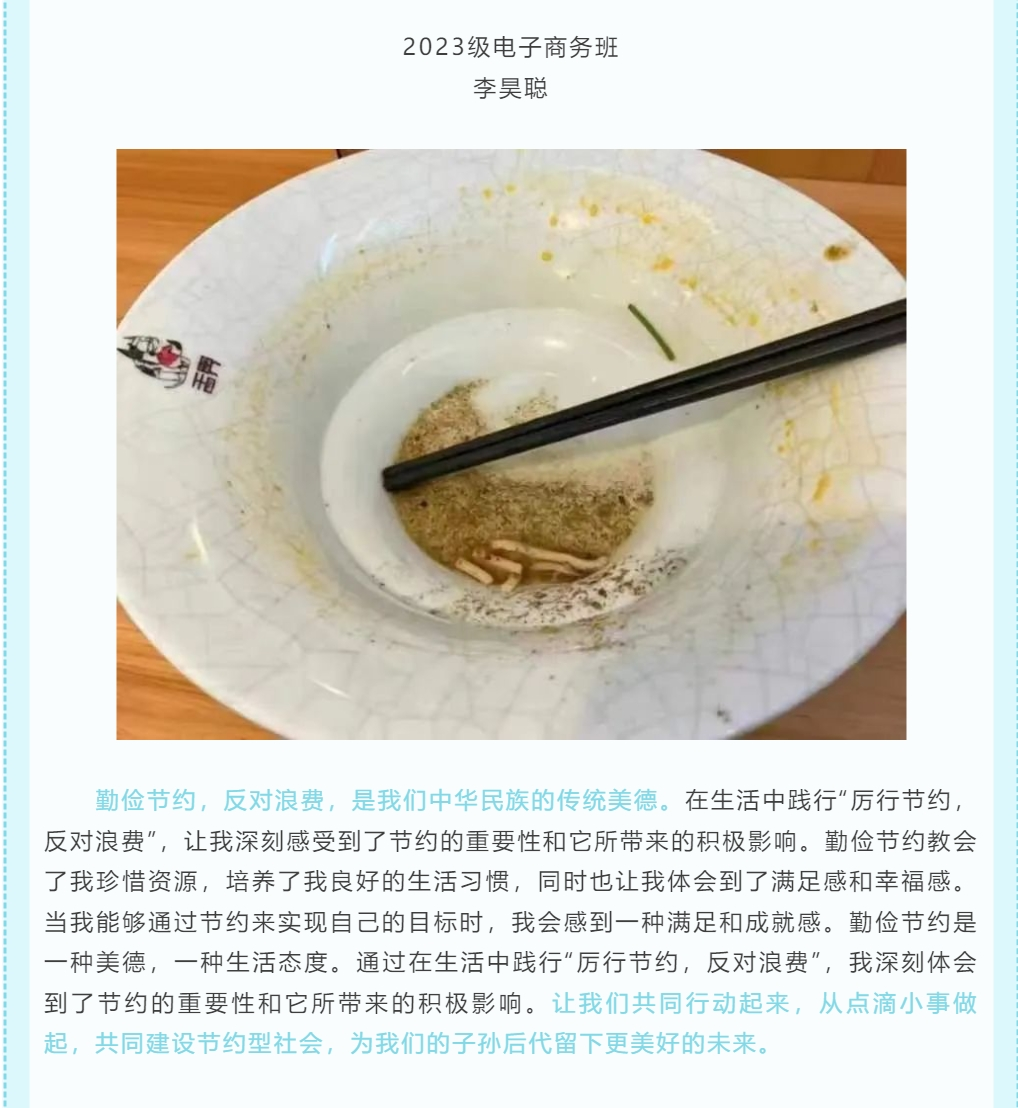 “厉行节约、反对浪费”不仅是一句简单的号召,更是我们需要长期躬身实践的行为。作为新时代青年员工应做勤俭节约的传播者、践行者、推广者,做到“君子以俭德辟难,不可荣以禄”。未来,信管学子将以更加饱满的热情积极投身到勤俭节约的行列之中,用行动书写新时代青年勤俭节约的壮丽答卷,让绿色之风盛行在生活的每一处角落!(beats365亚洲版官网供稿)