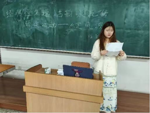 本次诵读篇目是宋代诗人苏轼的名篇《定风波·莫听穿林打叶声》。晚上6点30分,诵读活动准时开始,同学们在班级学习委员的带领下,在诵读中走进经典,品味诗风词韵。