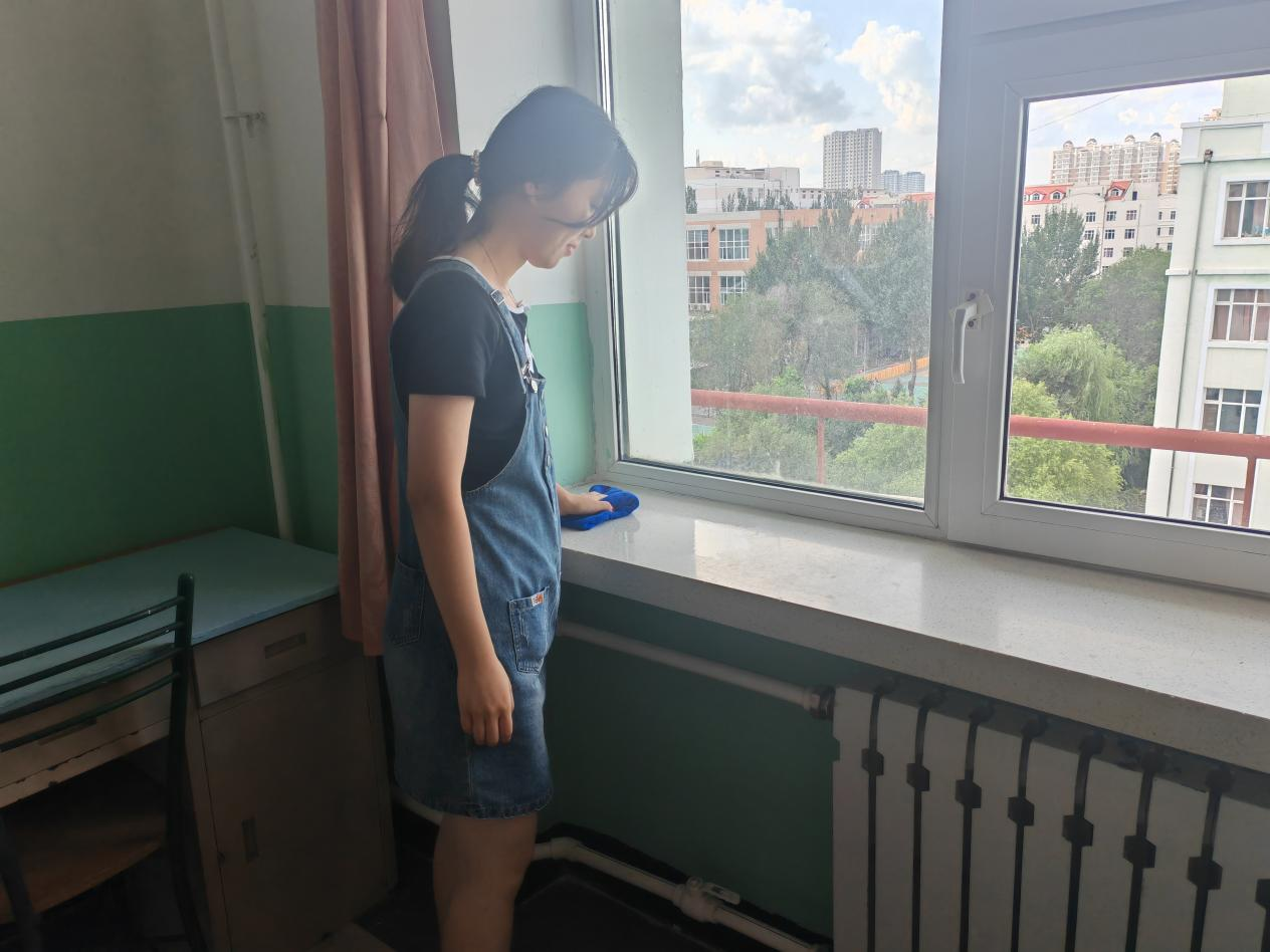 在打扫的过程中各位同学自备清洁工具,尽心尽力的擦拭,从阳台到地面,从桌面到凳子,从书架到衣柜,每一位同学都细心清洁寝室的每一处角落,不留下一片灰尘,竭尽所能,做好迎新第一步工作。最终,在所有同学的共同努力下,环境得到了很大的改善,为新生入学创造了一个温馨干净的寝室环境。