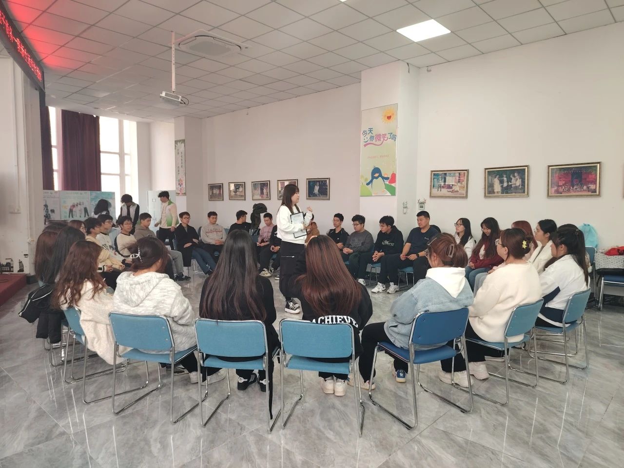 为帮助新生更快地适应老员工活,融入新环境。beats365亚洲版官网于10月14日至10月21日在老员工活动中心分班级开展了新生适应性团体辅导活动。本次活动由2024级辅导员郭曦萌老师带领,旨在通过本次活动增强新生的团队协作能力,建立良好的人际关系,同时提升新生心理素质,培养积极向上的心态。 活动伊始,郭曦萌老师向同学们介绍了适应性团体辅导的概念和意义,鼓励大家放松心情,积极参与其中。在首个游戏“大风吹”中,同学们围坐一圈,依口令行动,未抢到位置的同学自我介绍。通过快速交换座位和自我介绍,同学们逐渐消除了彼此之间的陌生感,现场气氛迅速活跃起来。