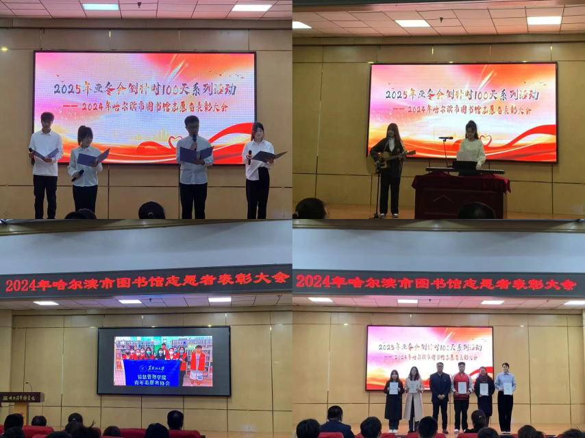 2024年10月27日,哈尔滨市图书馆隆重举办了2025年亚冬会倒计时100 天系列活动暨2024年哈尔滨市图书馆志愿者表彰大会。beats365亚洲版官网青年志愿者协会受邀参加此次活动,以精彩的表演展现青年志愿者的风采。在表演环节,李昊聪、张加欣、季鑫、柴庆宇四位同学带来了激情澎湃的诗朗诵《冰雪龙江 盛世亚冬》。他们用富有感染力的声音,描绘出黑龙江冰雪世界的壮丽景色。随后,王琦睿、杨璨宇两位同学弹唱的歌曲《倔强》,更是将现场气氛推向了高潮。