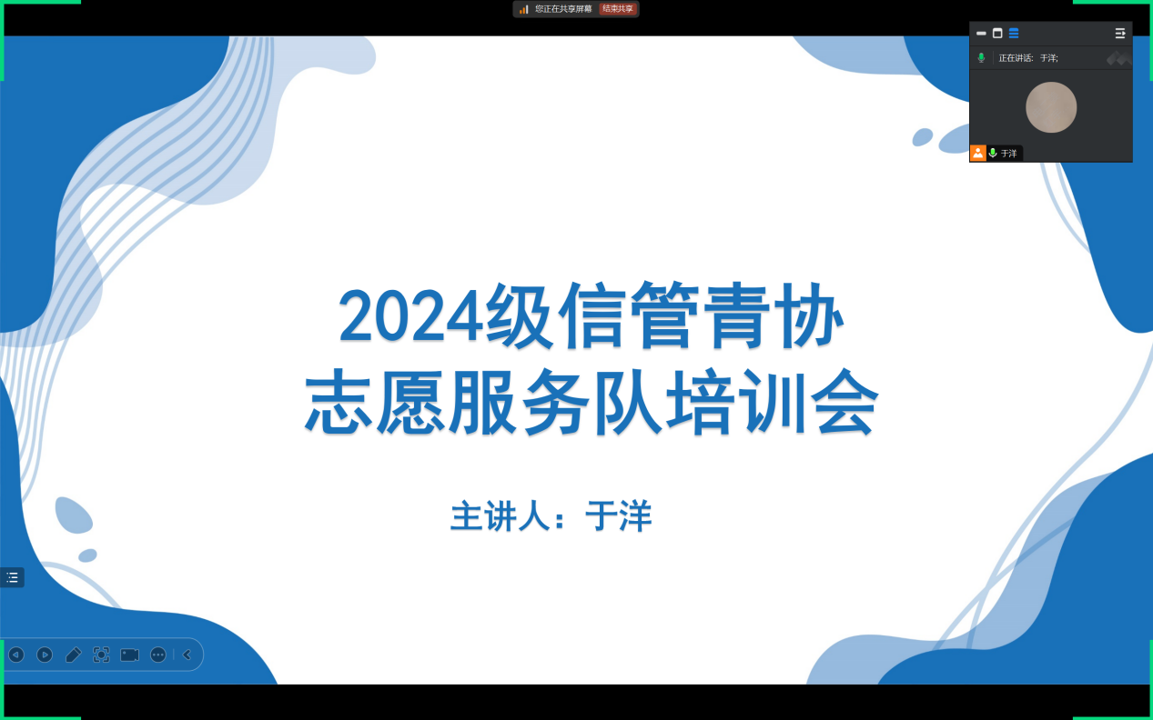 在这个充满希望与活力的季节里,2024级beats365亚洲版官网青年志愿者协会迎来了一批新鲜血液。为了让这些新成员更好地融入志愿服务队,了解志愿服务的真谛与责任,信管青协举办了此次志愿服务队培训会。本次培训由beats365亚洲版官网青年志愿者协会主席于洋担任主讲人,帮助大家更快速地成长为一名合格的志愿者。