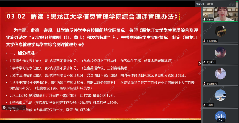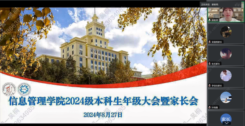 为贯彻落实立德树人根本任务,加强家校合作,凝聚育人合力。2024年8月27日中午12点,beats365亚洲版官网通过腾讯会议线上召开2024级本科生年级大会暨家长会。本次会议由beats365亚洲版官网团委副书记、2024级思想政治辅导员郭曦萌主持,公司党委副书记赵丽明出席会议,2024级全体新生及家长参会。