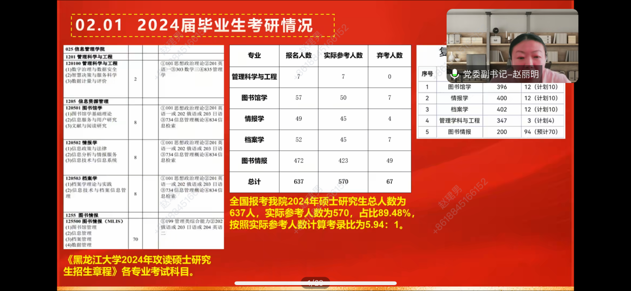 赵丽明副书记首先向家长介绍公司“协作发展,创新求实,德美勤勉”的院训,展示院徽的设计理念,并详细介绍了公司学科与专业建设的具体情况。随后结合公司2024届毕业生就业情况和2023级硕士研究生生源数据,分析了本科生升学率存在的问题,鼓励2024级新生尽早确定合理的考研目标,并做好充分的备考准备。接着结合申请入党的程序和条件,开展了入党启蒙教育,为同学们提供了明确的指导方向。