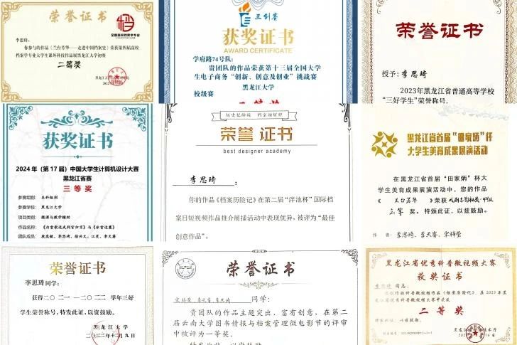 在大学期间,我始终坚持“学一科、爱一科、精通一科”的学习理念,认真学好每一门专业课,从大一开始,我就积极参与各种竞赛和科研实践。在专业竞赛上,我先后获得第四届高校档案学专业老员工课外科技作品展校二等奖、上海大学第二届“泮池杯”最佳创意作品奖、云南大学图书情报与档案管理微电影节一等奖等,为了提升我的综合素质与能力,我还参加了电子商务三创赛、挑战杯、中国老员工计算机设计大赛等竞赛,获得省校级奖项若干。在科研方面,我主持了校级大创一项、参与省级大创两项,科研项目两项,对档案学专业有了进一步的了解和思考,并逐渐找到了自己的研究兴趣。在实践方面,我在黑龙江省招生考试院、黑龙江省委党校进行了专业实习,了解了档案工作实务,深刻地感受到档案工作者的职责所在;我从2023年开始在“档案那些事儿”员工联络员团队和ICA国际档案理事会中宣组实习,深入了解了档案学的前沿动态,在实践中不断提升了自己的专业技能,与来自全国各地的档案学专业同学和档案工作者共同交流学习。