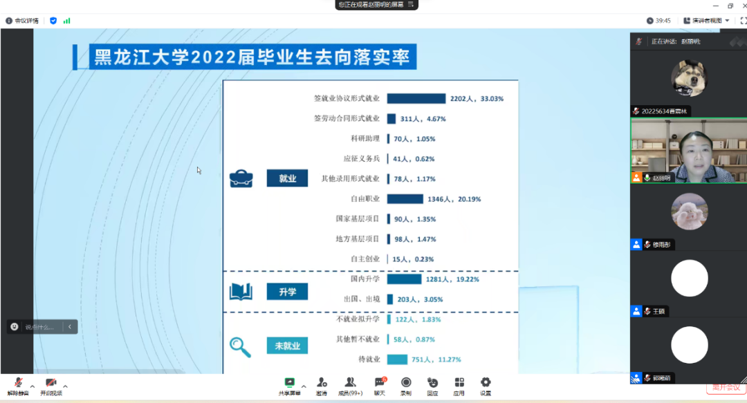会议伊始,赵丽明老师从公司近三年毕业生就业情况、毕业生去向、生源地就业三方面着手,结合公司2022年毕业生就业质量年度报告以及各省份城市录用榜单等数据,整体分析公司就业形势。对近期各省公务员联考、选调生和事业单位招聘考试进行解读,对非黑龙江生源、选择回生源地就业的毕业生就业进行具体指导,指出要充分利用年前年后时间,及时收集当地岗位招聘信息,积极参加当地线下招聘会。赵丽明老师强调,毕业生就业是关系个人、家庭和社会的民生工程,毕业生要不断着眼于社会大趋势,结合自身实际理性做出就业选择。