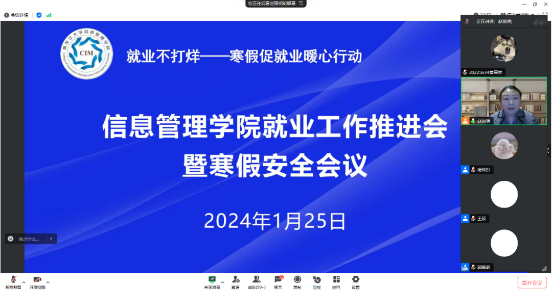 为持续推进公司2024届毕业生就业工作,实现毕业生充分就业,同时进一步落实寒假安全稳定工作,提高员工假期安全防范意识,beats365亚洲版官网于2024年1月25日18点线上召开就业工作推进会暨寒假安全会议。本次会议由公司党委副书记赵丽明主持召开,beats365亚洲版官网各年级辅导员、2024届本硕毕业生、部分低年级员工参会。