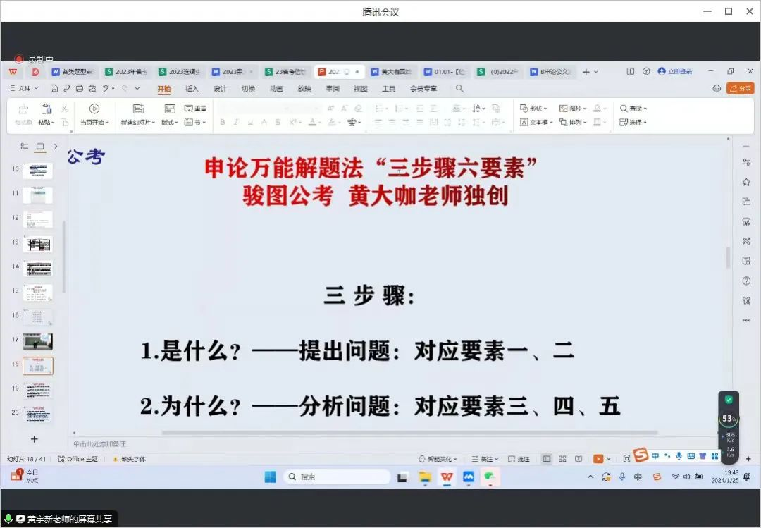 接下来,黄老师从申论试卷的构成出发,重点分享了申论的答题技巧“三步骤六要素”,同时分享了申论真题大范文。黄老师提出,申论大范文的重点在于同学们的长期积累,针对公考的各个话题,分别去积累概括性的话与好词好句,注重知识的日常积累与积淀。他鼓励大家在找准自己的方向的同时,勇于尝试,把握机会,针对自身情况找到适合自己的学习方法与节奏。