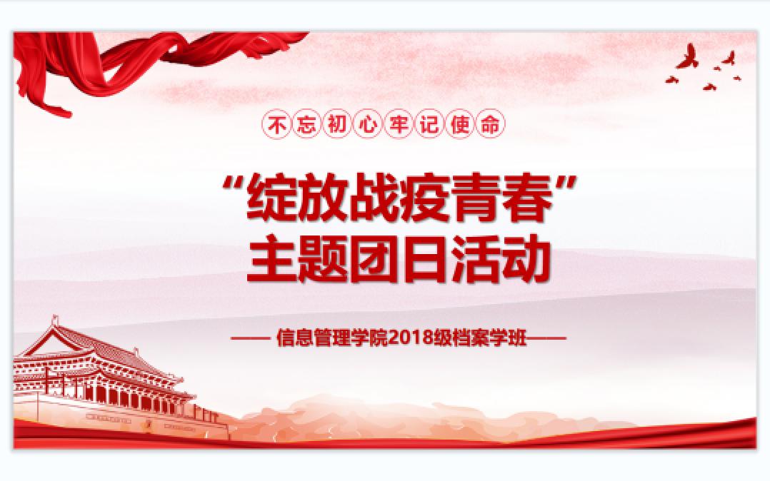 为深入学习习近平总书记关于疫情防控工作的重要讲话和指示批示精神,认真贯彻落实习近平总书记给北京大学援鄂医疗队全体“90后”党员的回信精神,激励和引领广大青年员工在党和人民最需要的地方贡献力量、绽放青春,2018级、2019级所有团支部组织开展以“绽放战疫青春”为主题的线上主题团日活动。