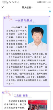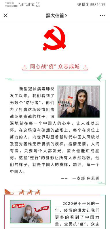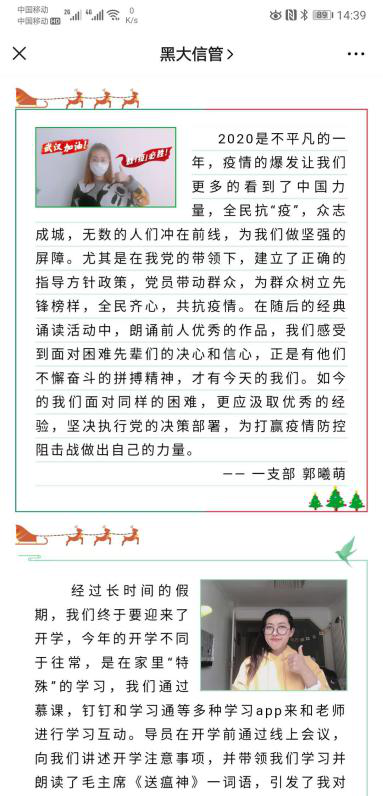 公司自3月8日起,辅导员和员工党支部书记分别通过线上平台组织员工党员上一堂“云党课”,带领员工党员集体进行经典诵读,并将员工党员对党课和经典诵读内容的感悟在公司微信公众平台“黑大信管”进行同步宣传和展示。云党课以“众志成城同战疫·青春共话爱国情”为主题,带领全体党员同学深入了解疫情下党和国家的作为,走近一线奋斗者,了解在疫情下从个人到组织的付出与担当。