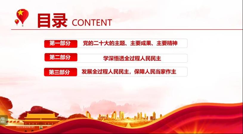 会议伊始,文记东以“发展全过程人民民主,保障人民当家作主”为主题,围绕“党的二十大的主题、主要成果、主要精神”、“学深悟透全过程人民民主”和“发展全过程人民民主,保障人民当家作主”三个部分展开讲述。