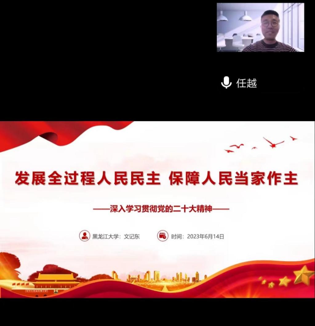 文记东详细介绍了党的二十大主题、主要成果和主要精神,引领师生深刻认识新时代十年的伟大变革及其里程碑意义,更加紧密地团结在以习近平同志为核心的党中央周围,高举中国特色社会主义伟大旗帜;紧接着从“什么是全过程人民民主”“全过程人民民主好在哪里”两个方面介绍了如何学深悟透全过程人民民主,带领师生深刻理解全过程人民民主丰富内涵和重大意义;第三部分文老师介绍了如何发展全过程人民民主,保障人民当家作主,全过程人民民主深深植根于中国大地,是我们党在新时代不断推进中国特色社会主义民主政治理论创新、制度创新、实践创新的经验结晶。最后,任越教授对本次宣讲会进行总结。