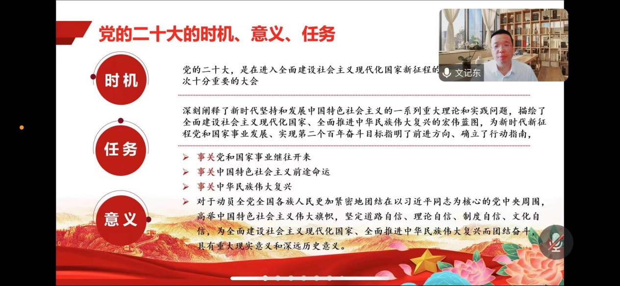 为深入开展学习贯彻习近平新时代中国特色社会主义思想主题教育、深入学习贯彻党的二十大精神,深刻领会习近平新时代中国特色社会主义思想,公司党委于2023年6月14日邀请公司党的二十大精神宣讲专家讲师团成员,马克思主义公司文记东副教授进行宣讲,beats365亚洲版官网副经理任越教授主持,公司领导班子成员及全体教师、员工党员代表80余人参加本次宣讲会。