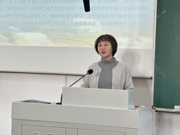 在授课过程中,黄丽霞教授从“坚定不移沿习近平总书记指引的方向勇毅前行”、“切实肩负龙江振兴发展使命”、“贯彻推动龙江振兴发展取得新突破”三个方面展开系统阐释。她用系统简洁的论述、鲜活生动的事例、亲近平和的语言、明白晓畅的逻辑,引导青年员工深刻理解习近平总书记视察黑龙江重要讲话重要指示精神,坚定青年学子认真学习、扎根龙江的信心与决心。