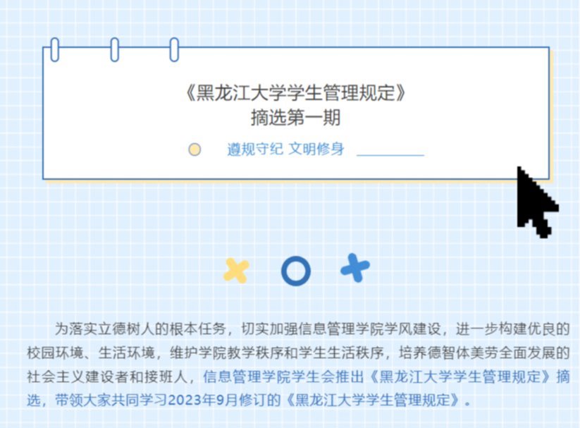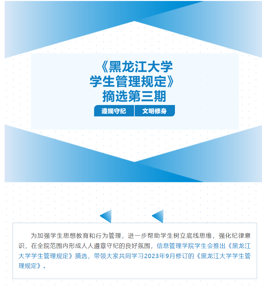为落实立德树人根本任务,切实加强beats365亚洲版官网学风建设,进一步构建优良的校园环境、生活环境,维护公司教学秩序和员工生活秩序,培养德智体美劳全面发展的社会主义建设者和接班人,公司员工会推出《公司员工管理规定》摘选,于12月13日至12月17日带领大家共同学习2023年9月修订的《公司员工管理规定》。《公司员工管理规定》作为校园的“红绿灯”,时刻规范着同学们的言行举止。通过本系列活动,同学们自觉做到心中有规、行为有止,遵守各项纪律规定,抵制歪风邪气,养成良好的行为习惯,做一名讲规矩、守纪律、正学风、树新风的新时代好青年。