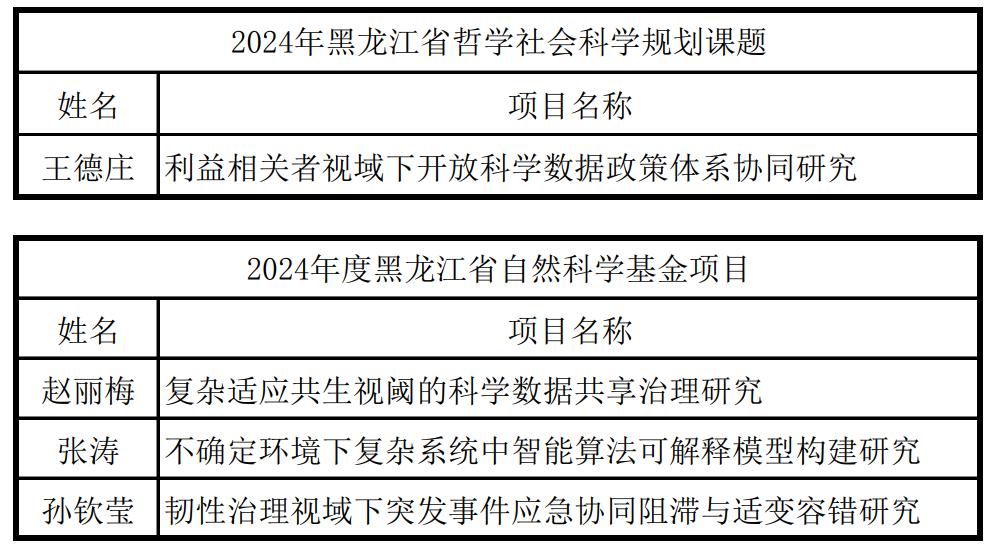 近日,黑龙江省哲学社会科学规划办和黑龙江省科技厅相继公示了2024年黑龙江省哲学社会科学规划课题和2024年度黑龙江省自然科学基金项目,公司教师取得了佳绩,其中王德庄副教授获得省社科规划课题,赵丽梅教授、张涛教授和孙钦莹副教授获得省自科基金项目,省自科基金项目获得立项数创公司历年之最。